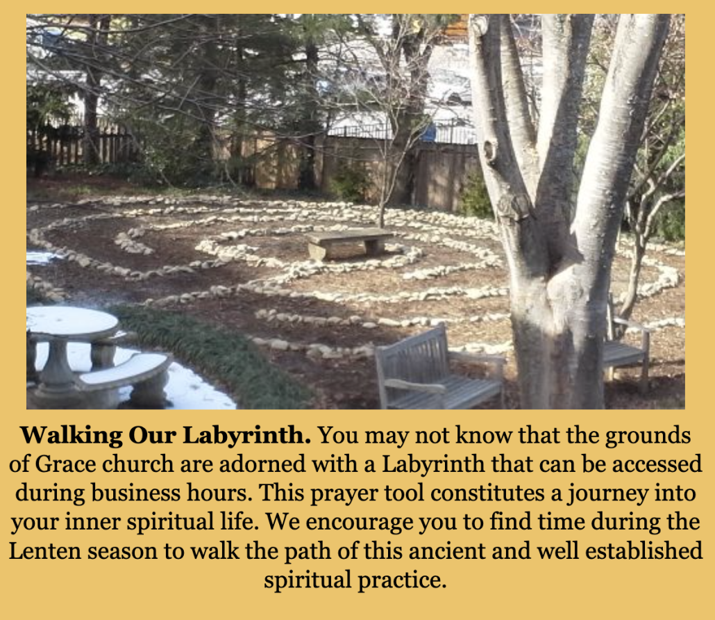 A personal Lenten invitation to come and experience this prayer service will be extended to members of specific ministries at Grace each week, but all are welcome any Wednesday. Come and see if this might be the special spiritual discipline you have been seeking.