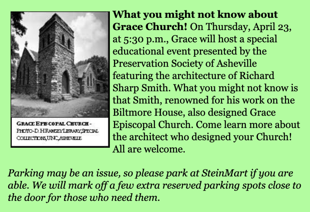 Sunday In-Person Services are now open to all (Masks are optional). Services will also be LiveStreamed, accessible through the Grace Church Asheville YouTube Channel, found HERE. Access the service bulletins through links at the top of our home page, or in the description of each service.